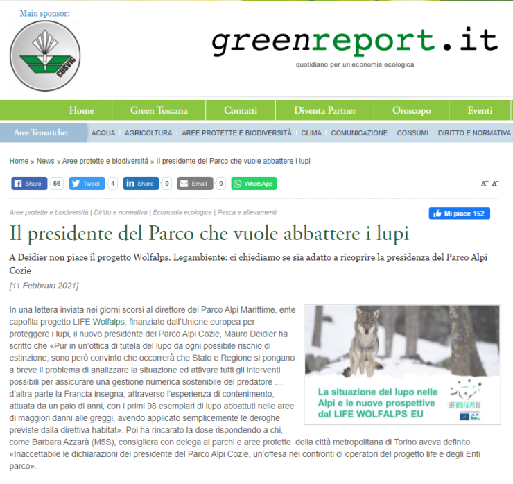 Visita il sito GreenReport.it e leggi l’articolo sulle questioni predatorie legate al progetto LIFE “WolfAlps”
