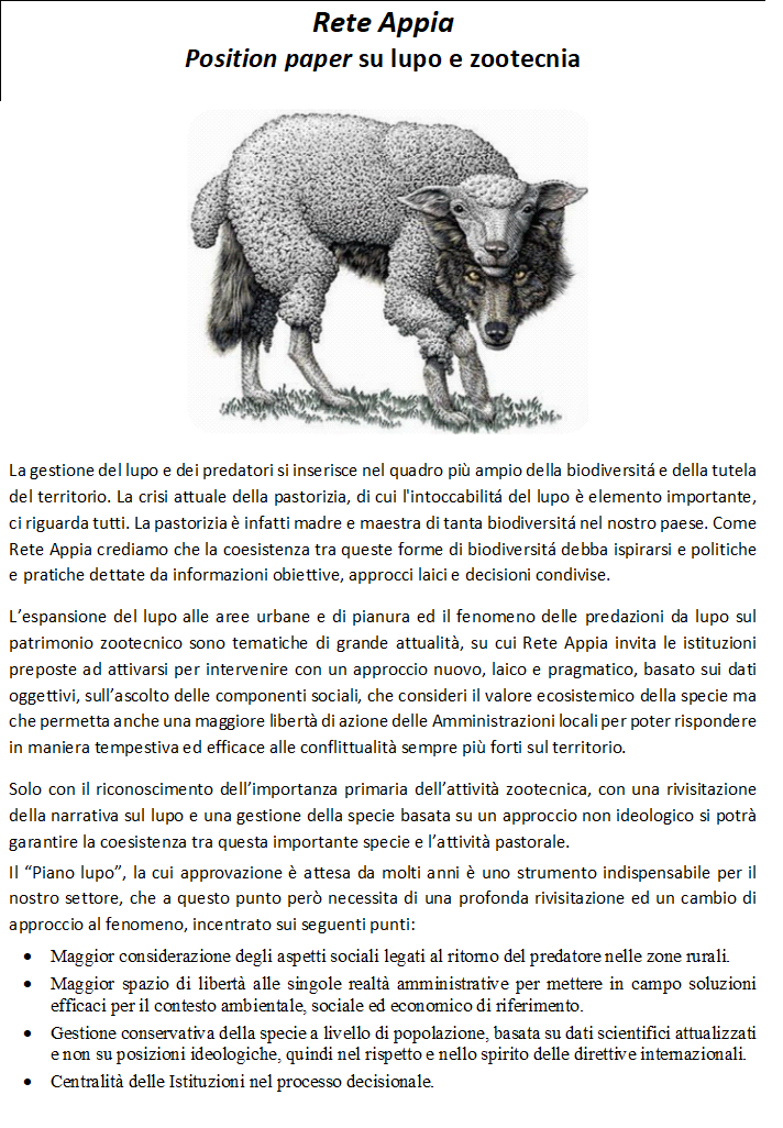 La gestione del lupo e dei predatori si inserisce nel quadro più ampio della biodiversitá e della tutela del territorio. La crisi attuale della pastorizia, di cui l’intoccabilitá del lupo è elemento importante, ci riguarda tutti. La pastorizia è infatti madre e maestra di tanta biodiversitá nel nostro paese. Come Rete Appia crediamo che la coesistenza tra queste forme di biodiversitá debba ispirarsi e politiche e pratiche dettate da informazioni obiettive, approcci laici e decisioni condivise.